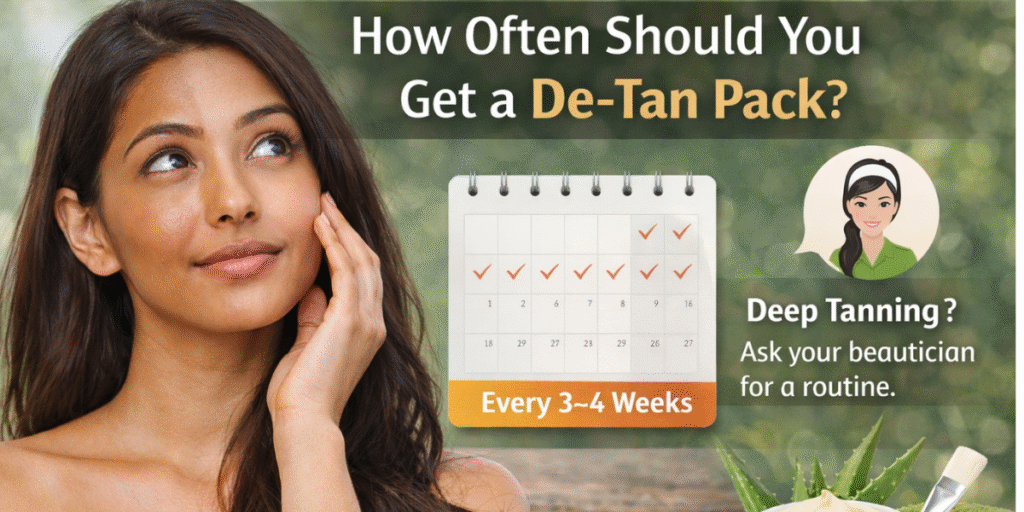 For normal tanning, a de-tan pack can be done once every 3–4 weeks. If tanning is deep, your beautician may suggest a proper routine based on your skin condition.